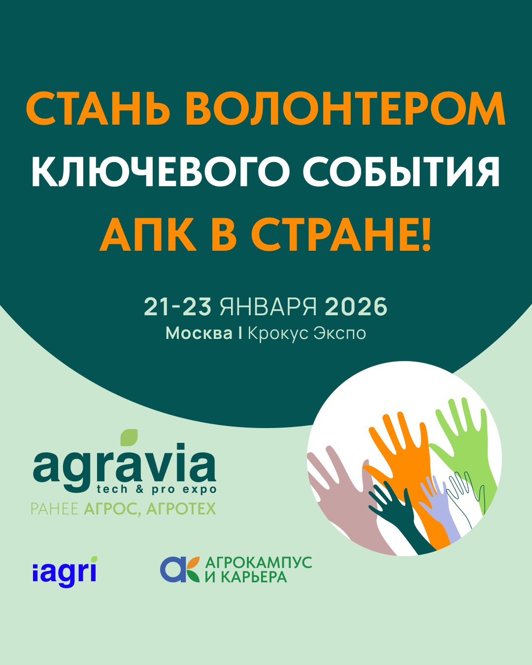 В 2026 году мы объединяем две мощные выставки - AGRAVIA и iAGRI, чтобы показать всю мощь и технологии АПК. И мы ищем самых энергичных и ответственных ребят, которые помогут нам создать это грандиозное событие.